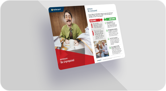 MISTAKE #1: Be Unprepared If your listing presentation starts during the presentation itself, you’ve already lost. While a goal of the meeting is to learn more about the individual, you need to come prepared. BAD ADVICE GOOD ADVICE Don’t speak to the Have an initial phone prospective client before the conversation with your lead. listing presentation: you want Learn why they’re selling the to walk in cold and win this property (upgrading? baby on the on charm and poise alone. way? job transfer?) and what their selling goals are (speed? profit?). Be sure to not to know anything about the property, Learn what they’re looking for neighborhood, or estimated in an agent and how many other property values. Make sure agents they’re interviewing. This the presentation is the first can help you position yourself time you’ve been to the against the competition, or strike property. There’s something while the iron is hot if you’re the special about that first time only one they’re considering. you arrive, so cherish it. Learn about the property. Drive by the property and snap a photo, which can help you get a sense for the neighborhood and learn what’s unique about the property you could highlight in the listing. Run a competitive market analysis (CMA) to learn about the active, pending, and sold listings in the area. While it does MISTAKE #1: take extra effort, it’ll help you in the presentation set expectations Be Unprepared for the home seller about what their home might be worth. 4 MATTERPORT.COM SALES@MATTERPORT.COM +44 (0) 20 3874 7580 © 2018, Matterport. All rights reserved. Matterport and the 3D cube logo are trademarks of Matterport, registered in the United States and in other 5 countries. All other trademarks are the property of their respective owners.