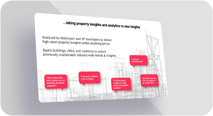 19 Analyzed by Matterport and 3P developers to deliver high-value property insights unlike anything before Spans buildings, cities, and countries to unlock previously unattainable industry-wide trends & insights Find the largest conference room across all my office locations Whats the average size of a kitchen in all London flats? How many of my retail stores have at least two checkout counters? How many windows in the building? Locate all sprinkler heads 19