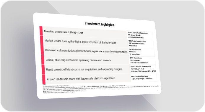 Massive, unpenetrated $240B+ TAM >$230T Global Real Estate Assets 20B Spaces Globally <0.1% Digital Penetration Market leader fueling the digital transformation of the built world 100X Rest of Market in SUM 10B Square Feet Scanned 4M Buildings Unrivaled software & data platform with significant expansion opportunities 3B+ 3D Data Points 64 Patents 10 Years of R&D Global, blue chip customers spanning diverse end markets 250K+ Subscribers 150+ Countries 112% Net Revenue Retention Rapid growth, efficient customer acquisition, and expanding margins 59% CY19-CY25E Revenue CAGR 12x CY20E LTV / CAC 2,500 bps of GM Expansion CY19-CY25E Proven leadership team with large-scale platform experience Prior Executive Experience: Apple, eBay, Google, & Salesforce 33 Notes: Patents includes issued and pending applications Net revenue retention compares the revenue from active subscriber accounts in 4Q19, excluding variable revenue, to the revenue generated in 4Q20 by those same accounts. LTV / CAC is calculated as the quotient of the product of the average subscription revenue per subscriber multiplied by subscription gross margin and revenue churn rate, divided by the quotient of sales and marketing expense and total new paid subscribers Gross margin estimates for CY21-CY25 exclude stock-based compensation expense TAM estimate from Savills World Research and the Company